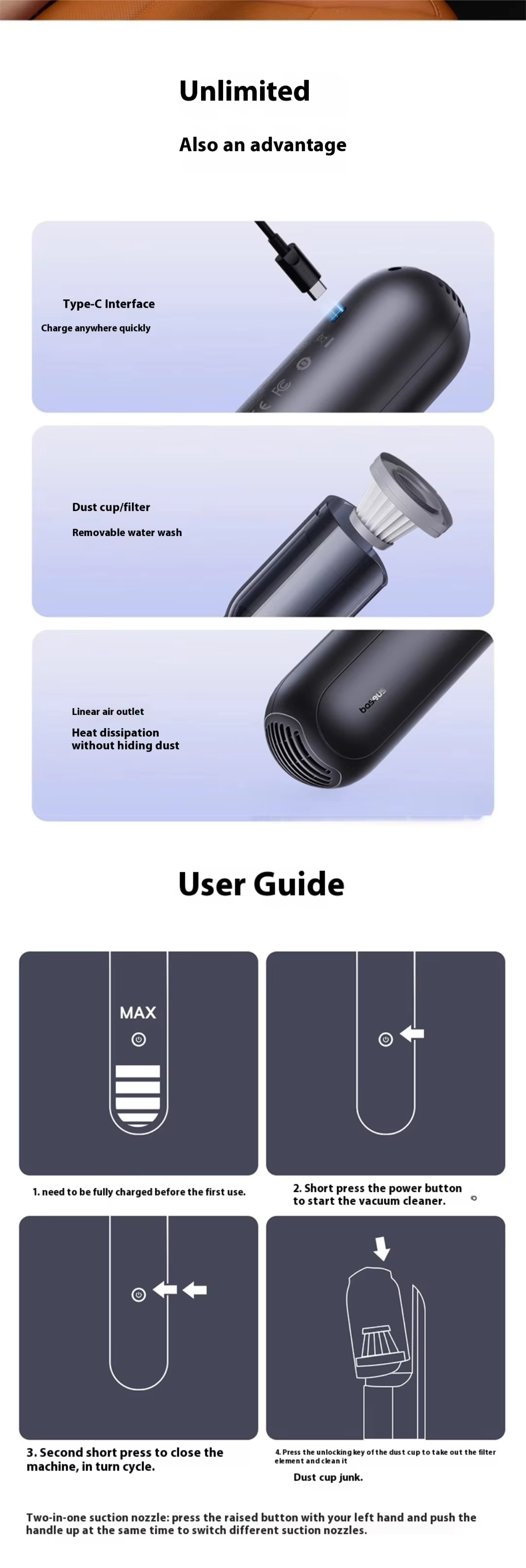Prev: Car Vacuum Cleaner with Super Strong 11000Pa Suction Handheld USB Rechargeable Blowing and Suction Integrated ABS Material